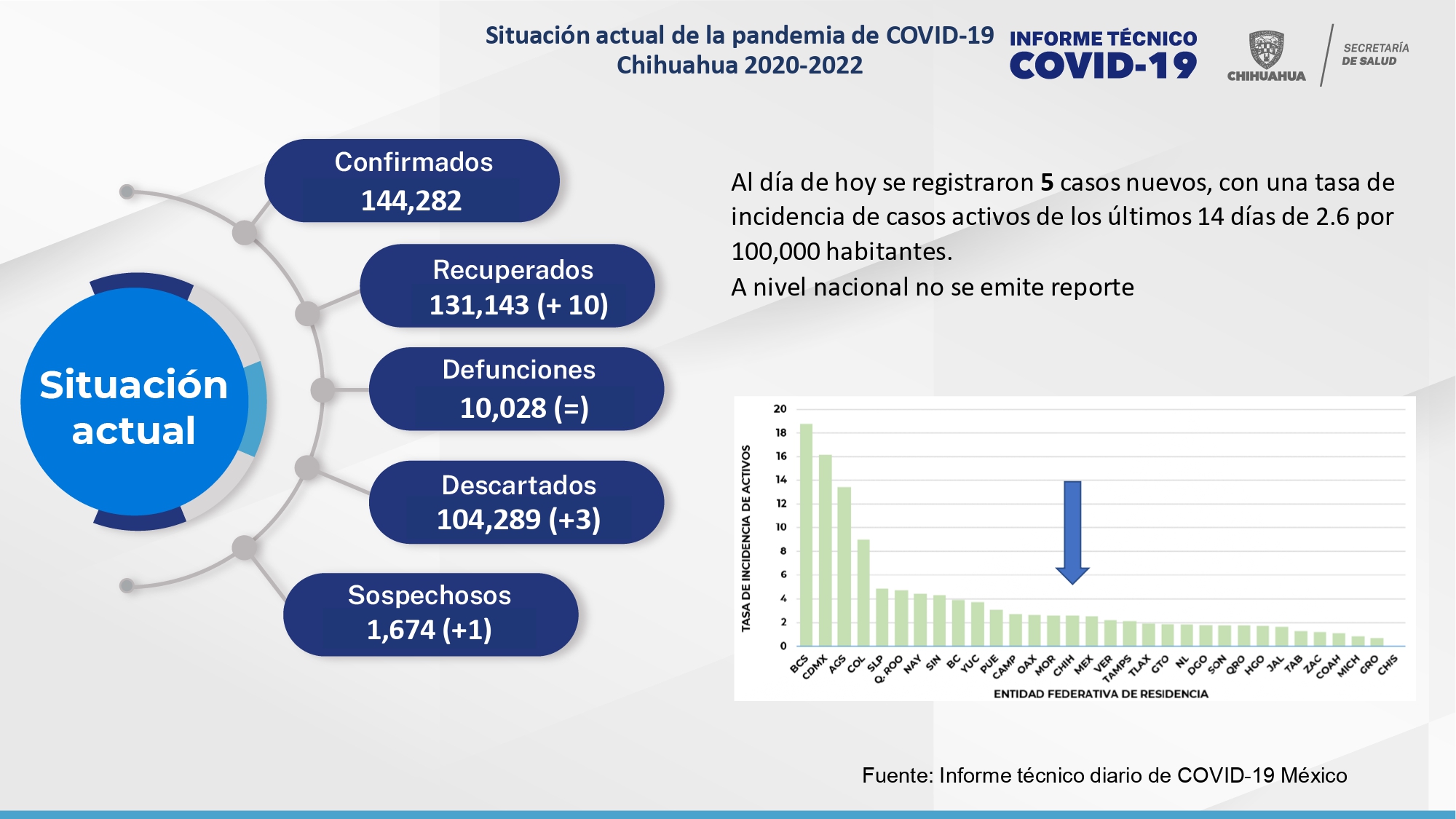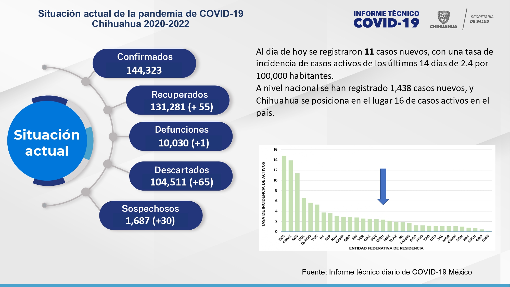 A nivel nacional se registraron 1,075 casos nuevos y el estado de Chihuahua se posiciona en el lugar 15 de casos activos en el país, por lo que presenta una tasa de incidencia de los últimos 14 días, de 2.4 casos activos por cada 100 mil habitantes.