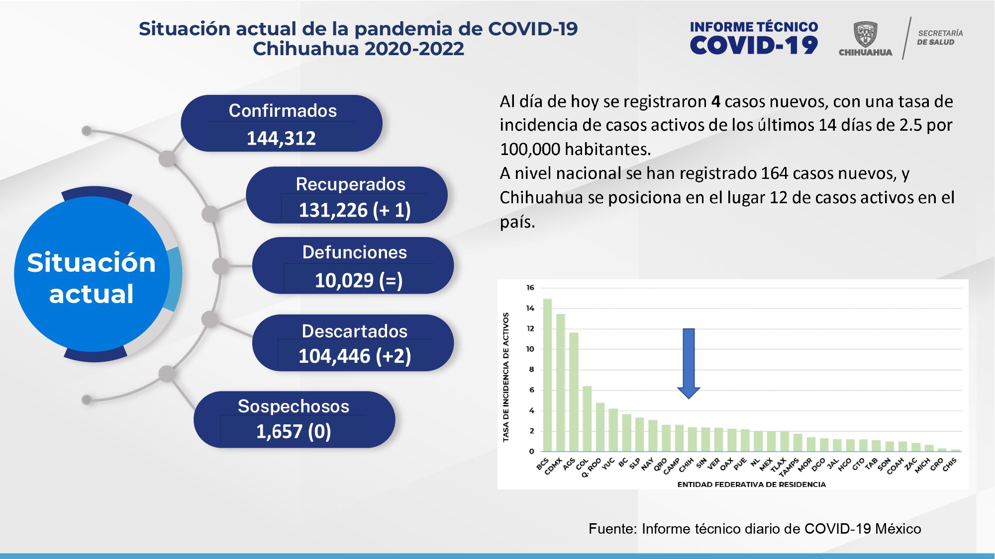 La cantidad de casos confirmados con este padecimiento ascendió a 144 mil 349 (+14) y estos casos nuevos se registran en los municipios de Juárez (+2), Chihuahua (+8), Cuauhtémoc (+1), Delicias (+1), Guachochi (+1) y Jiménez (+1).