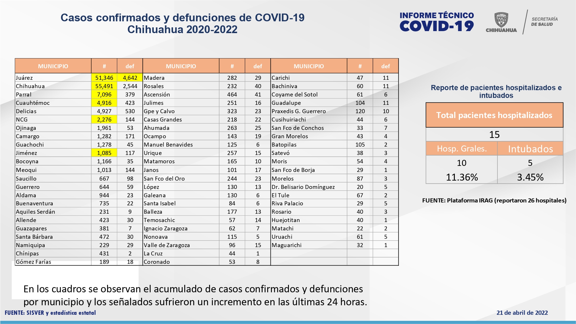 Asi es como la Secretaría de Salud de Chihuahua, presentó este 22 de abril el reporte COVID-19, en el cual se registra un acumulado de 144 mil 349 (+14) casos confirmados, 131 mil 333 (+28) casos recuperados, 104 mil 629 (+61) casos descartados y mil 708 (+12) casos sospechosos.