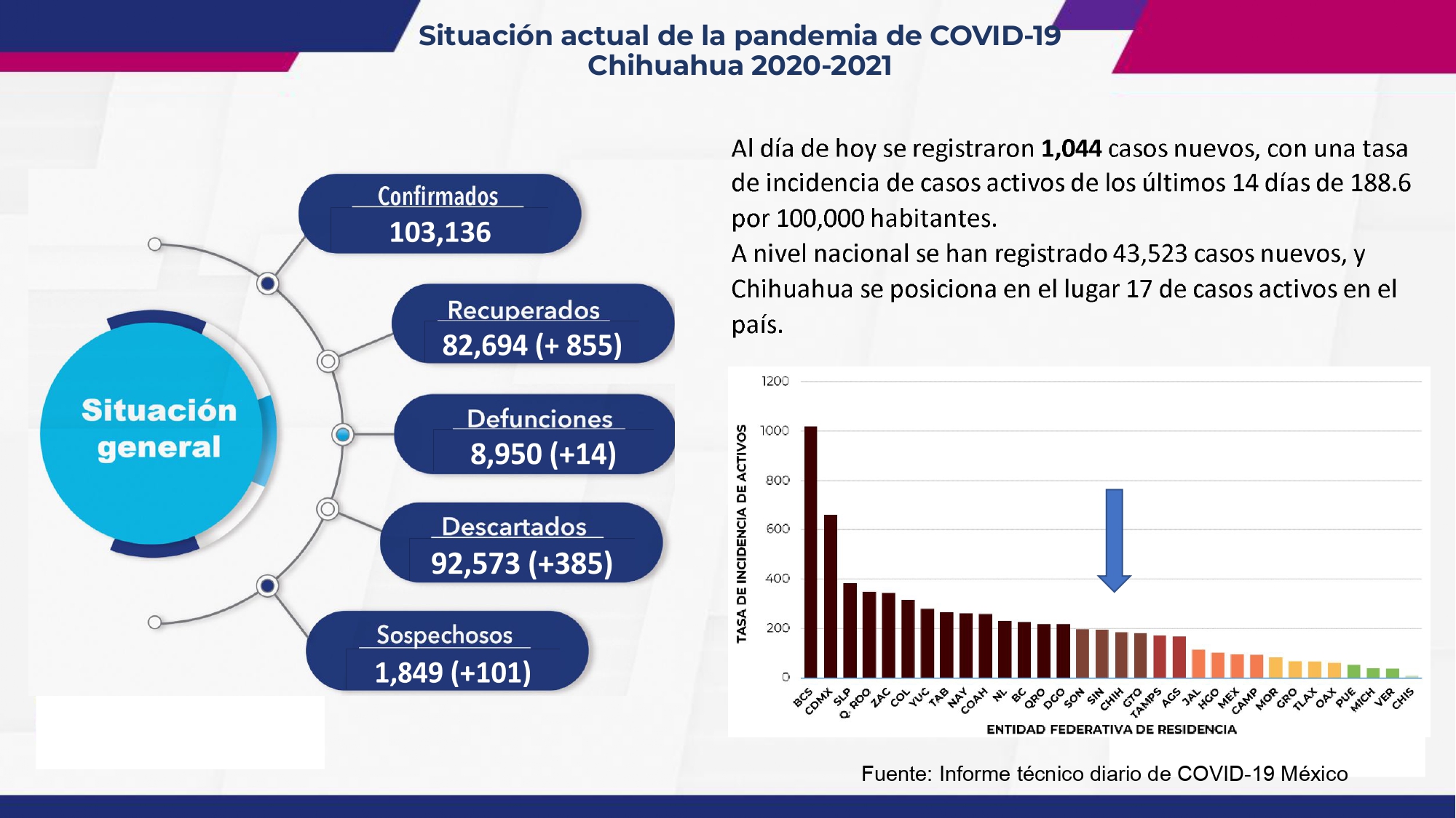En las últimas horas se confirmaron mil 44 nuevos contagios de los cuales 201 fueron en Juárez y 11 muertos, en Chihuahua capital fueron 446 nuevos c casos y 1 muerte por COVID