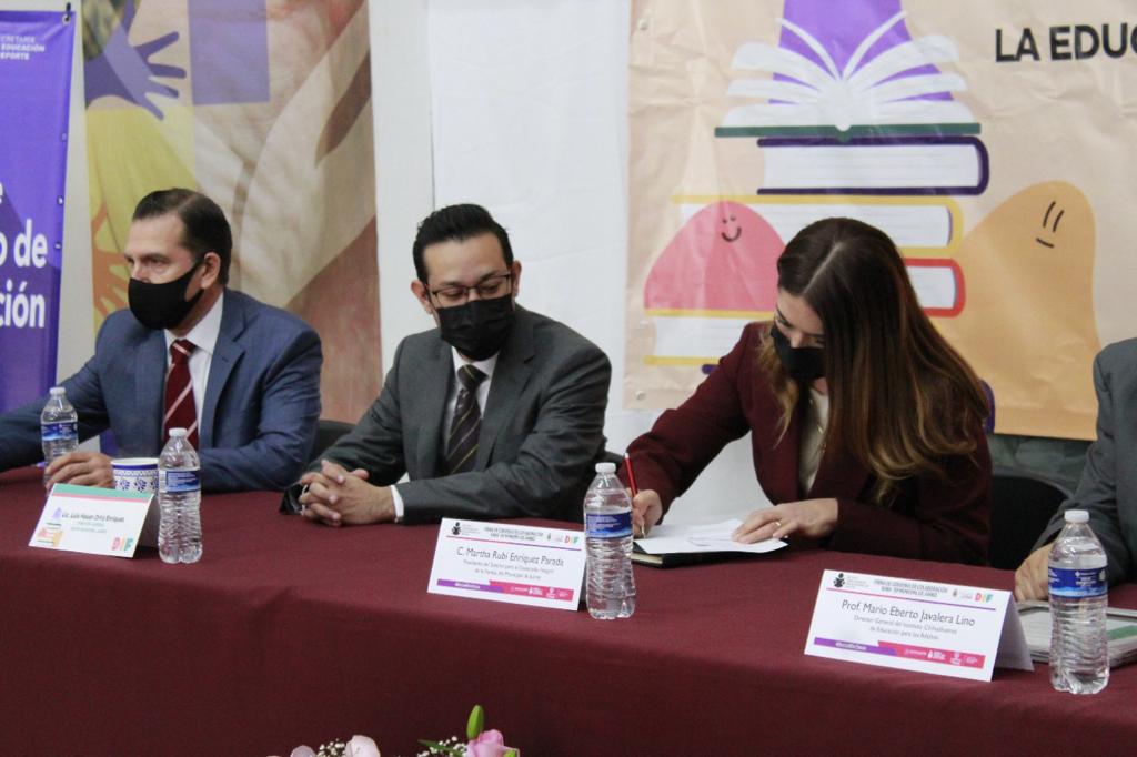 Rubí Enríquez, presidenta del Sistema de Desarrollo Integral de la Familia y el titular del ICHEAcabezaron la firma de un convenio de colaboración junto a autoridades estatales y municipales