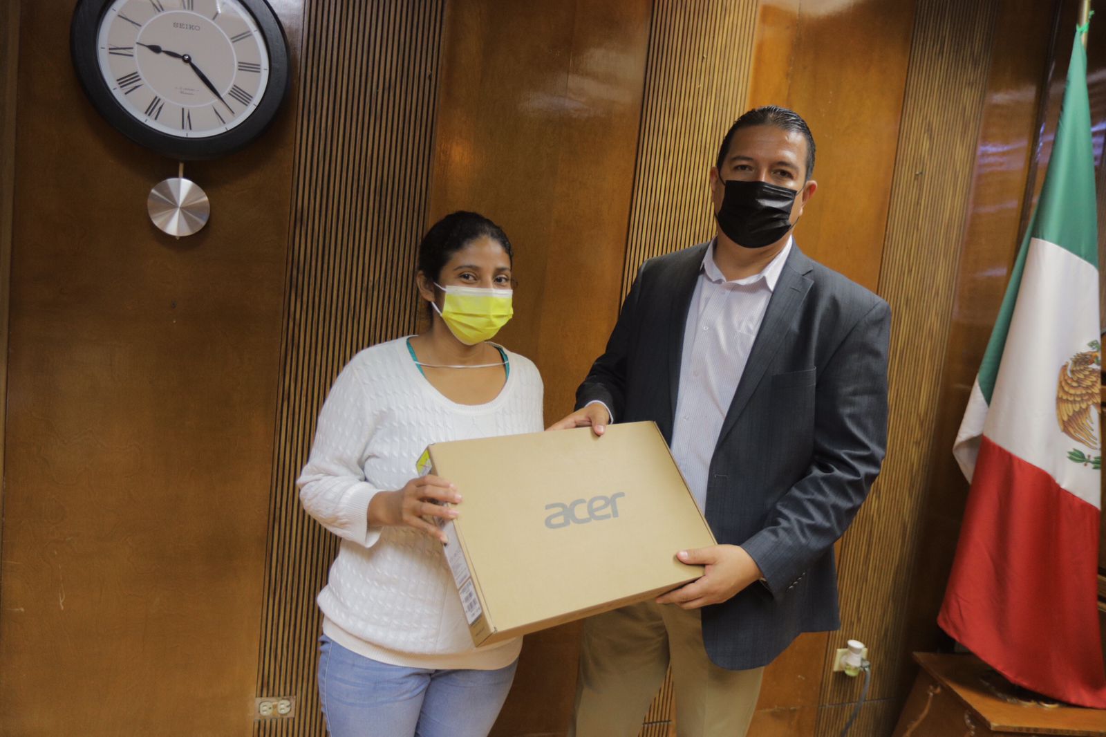 La Dirección de Atención Ciudadana, a nombre del Presidente Municipal Cruz Pérez Cuéllar, entregó una computadora laptop a los niños Jorleit Guadalupe y Joel Gregorio