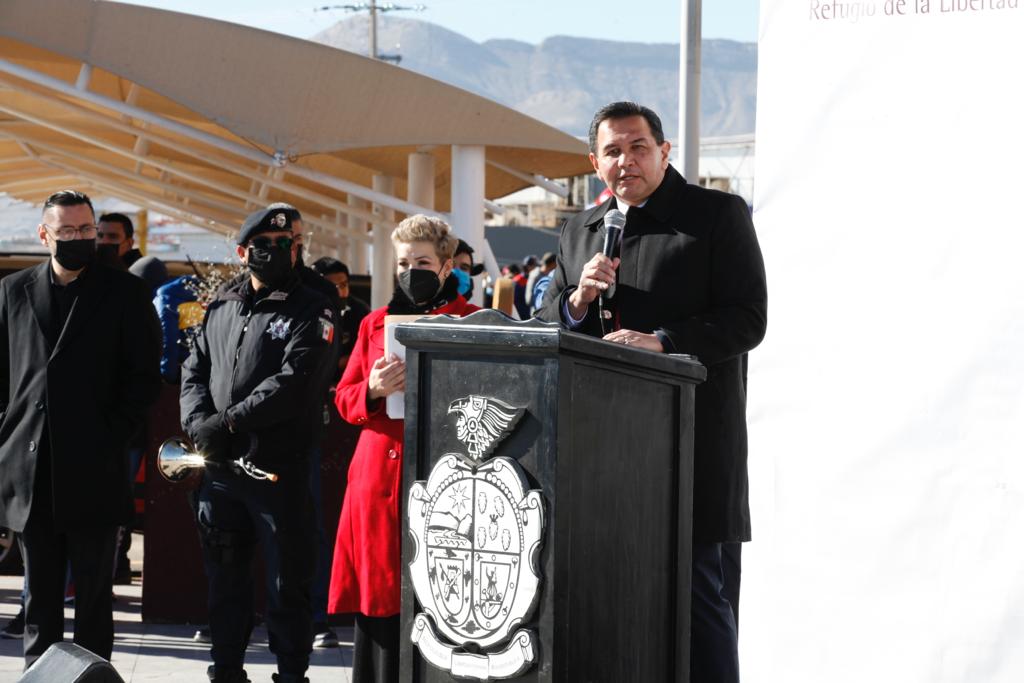 Durante la ceremonia de izamiento de la Bandera Nacional que organiza la Dirección de Educación, el Presidente Municipal, Cruz Pérez Cuéllar, refrendó su compromiso con los juarenses