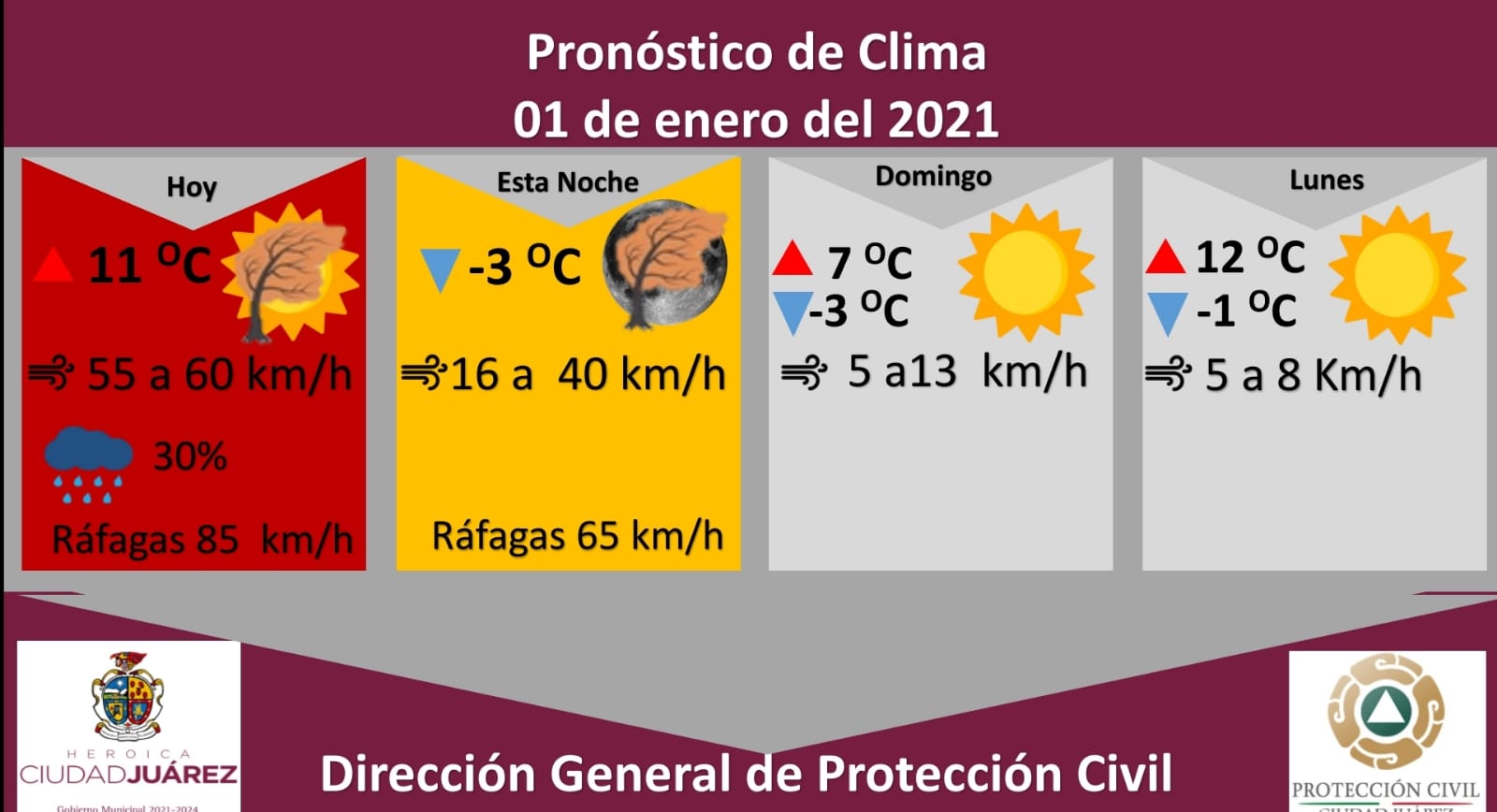 La Dirección de Protección Civil municipal, emitió una alerta roja debido a ráfagas de viento que alcanzarán los 85 kilómetros por hora, además de un 30 por ciento de probabilidad de lluvia