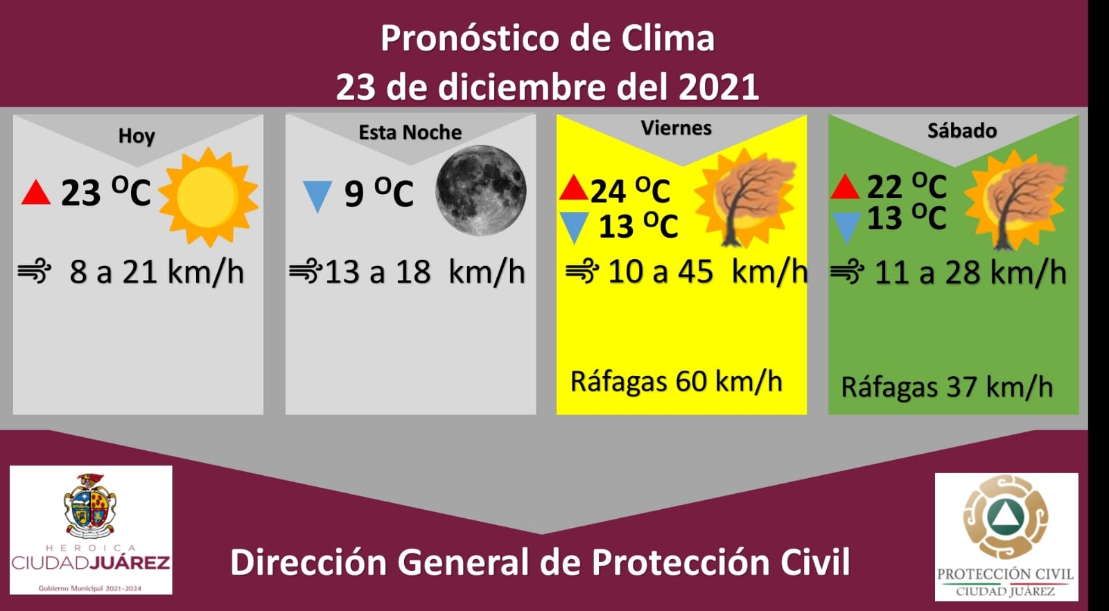 La Dirección General de Protección Civil Municipal pronosticó alerta amarilla para este viernes, por ráfagas de 60 kilómetros por hora y alerta verde para el sábado por ráfagas de 37 kilómetros por hora