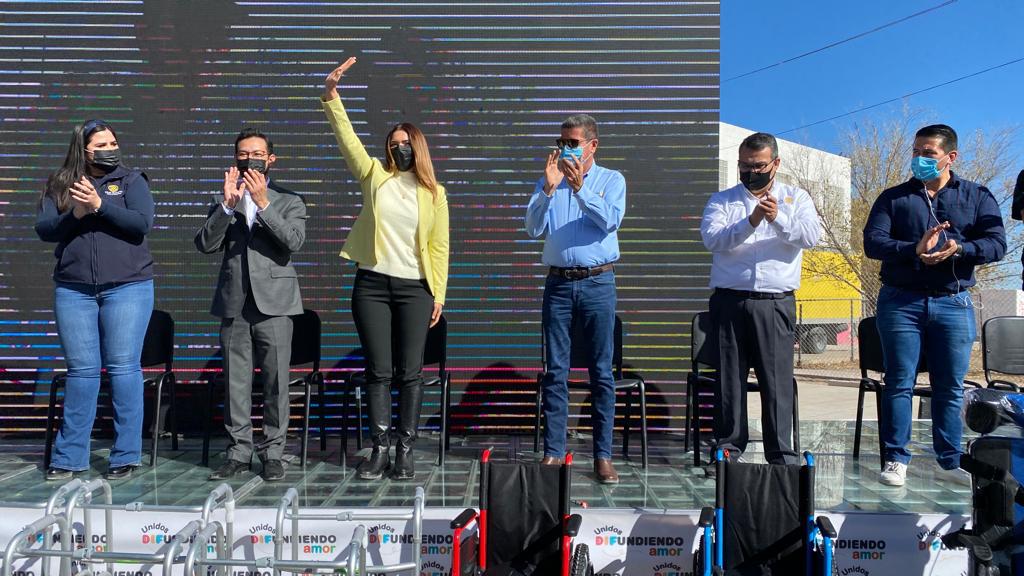 La presidenta del Sistema de Desarrollo Integral de la Familia Juárez, Rubí Enríquez, junto al director general Hasan Ortiz, hicieron entrega de aparatos funcionales durante un evento realizado en el Centro DIF Suroriente de Atención Integral para las Familias Olivia Espinoza