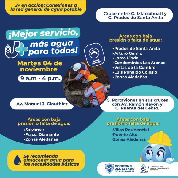 Los trabajos se realizarán en distintos puntos de la ciudad y afectarán temporalmente el suministro en varias colonias