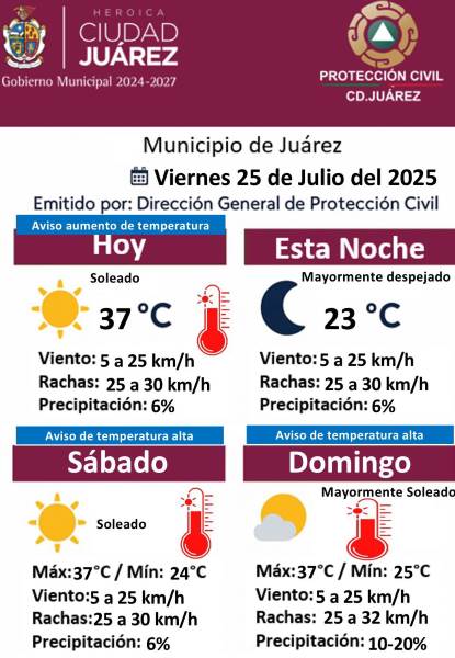 La Dirección General de Protección Civil del Municipio de Juárez emitió este viernes 25 de julio un aviso meteorológico en el que se alerta sobre un incremento en las temperaturas para los próximos días
