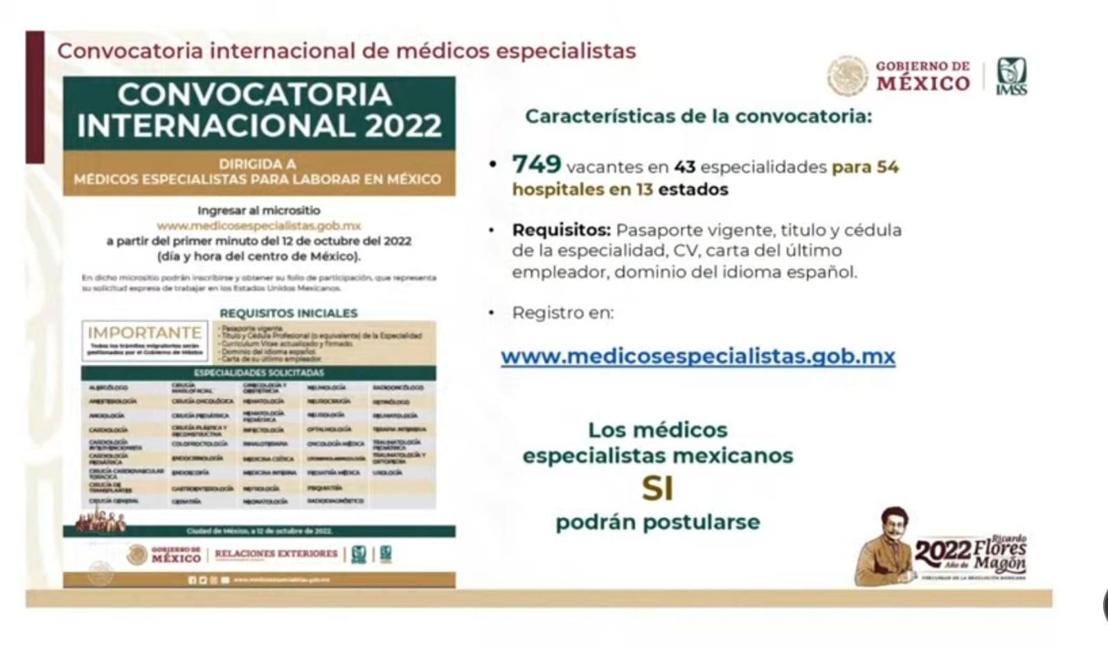 El director general del Instituto Mexicano del Seguro Social Zoé Robledo anunció la publicación de la convocatoria para la contratación de especialistas y cubrir el servicio en por lo menos 54 hospitales ubicados en 13 estados de la república, pero ahora se busca atraer a profesionistas de otros países.