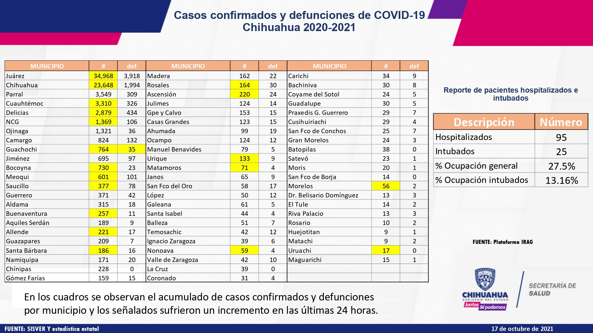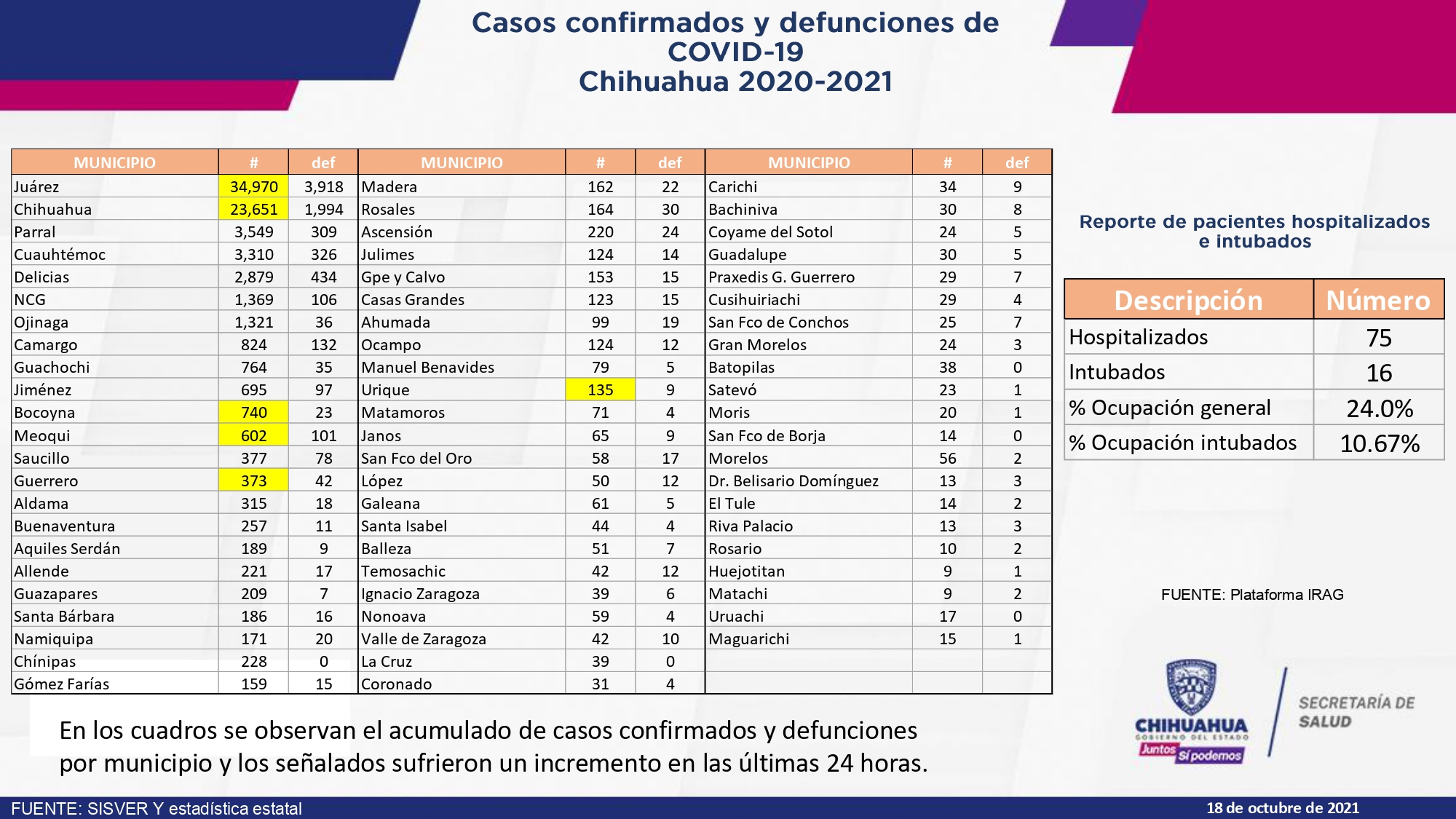 La Secretaría de Salud de Chihuahua, presentó este 17 de octubre el reporte COVID-19, en el cual se registran 79 mil 850 (+100) personas confirmadas en la entidad por este padecimiento