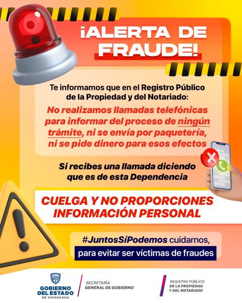 La Dirección del Registro Público de la Propiedad y del Notariado, alerta a las y los ciudadanos por el reporte de llamadas fraudulentas de un supuesto funcionario que dice ser empleado de esta oficina, donde ofrece agilizar algún trámite
