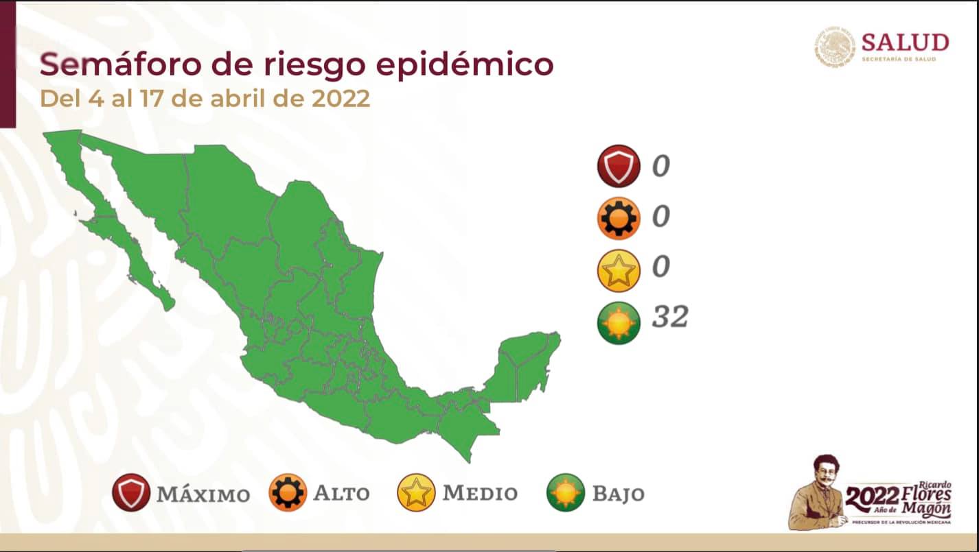Por segundo periodo consecutivo, 32 entidades en verde del Semáforo de Riesgo Epidémico; disminuyen 35% casos estimados en comparación con la semana anterior
